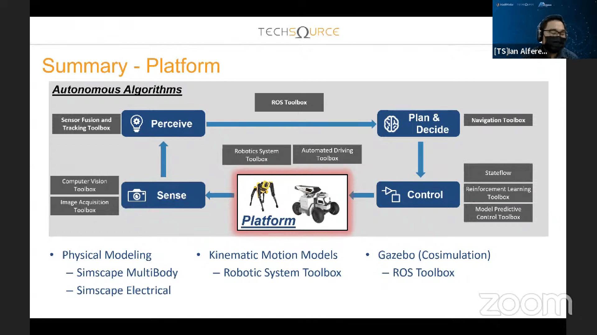 Manajer Teknik Aplikasi TechSource Systems, Ian Alferez, mengatakan terdapat tiga topik utama terkait pengembangan robot otonom yang dibahas. Ketiga topik tersebut berfokus pada pemanfaatan platform untuk pengembangan Quadrupled, Ground Vehicle Robot, dan Humanoid Robot. “Akan dibahas juga mengenai sistem pengoperasian robot dengan Matlab dan sistem navigasi,” terangnya.