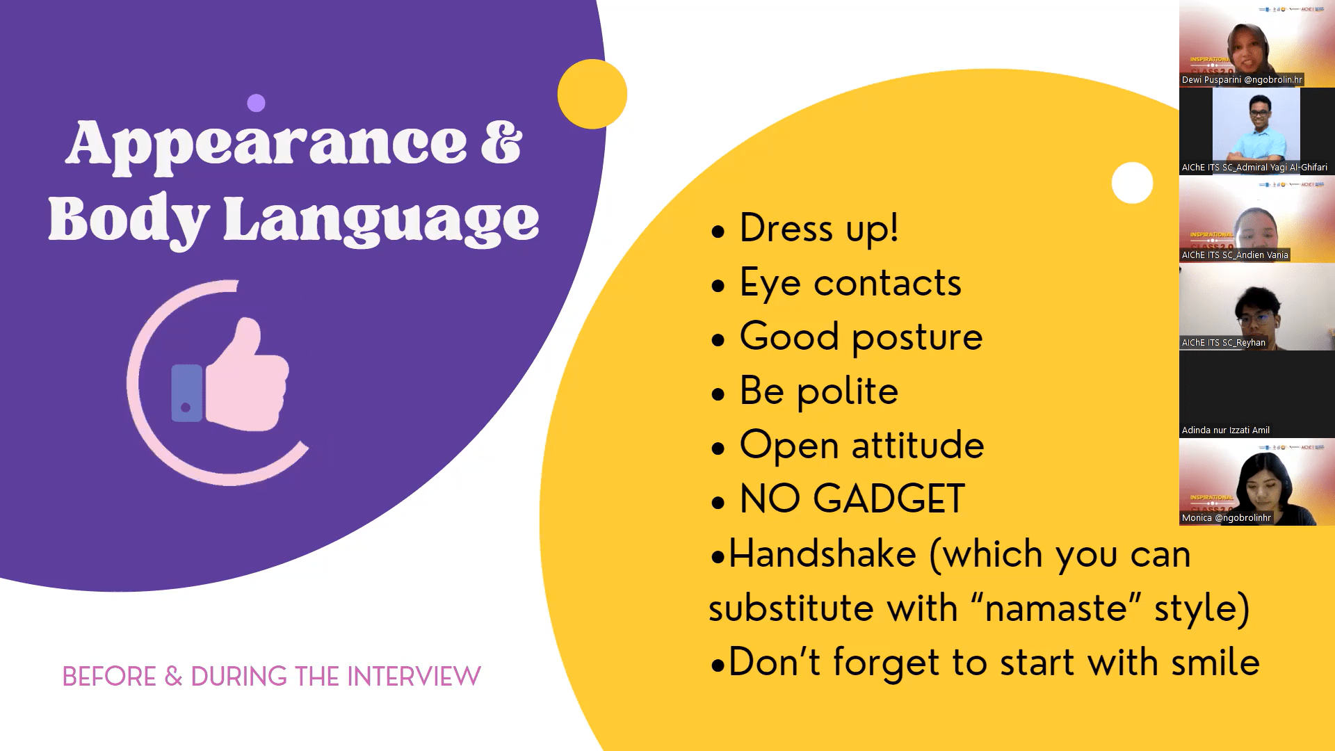 Dewi Pusparini, HR Professional in Energy and Shipyard Companies sebagai pemateri dalam gelaran Inspirational Class 2.0 dengan tajuk How to Show Off your Amazing Skills During Job Interview.