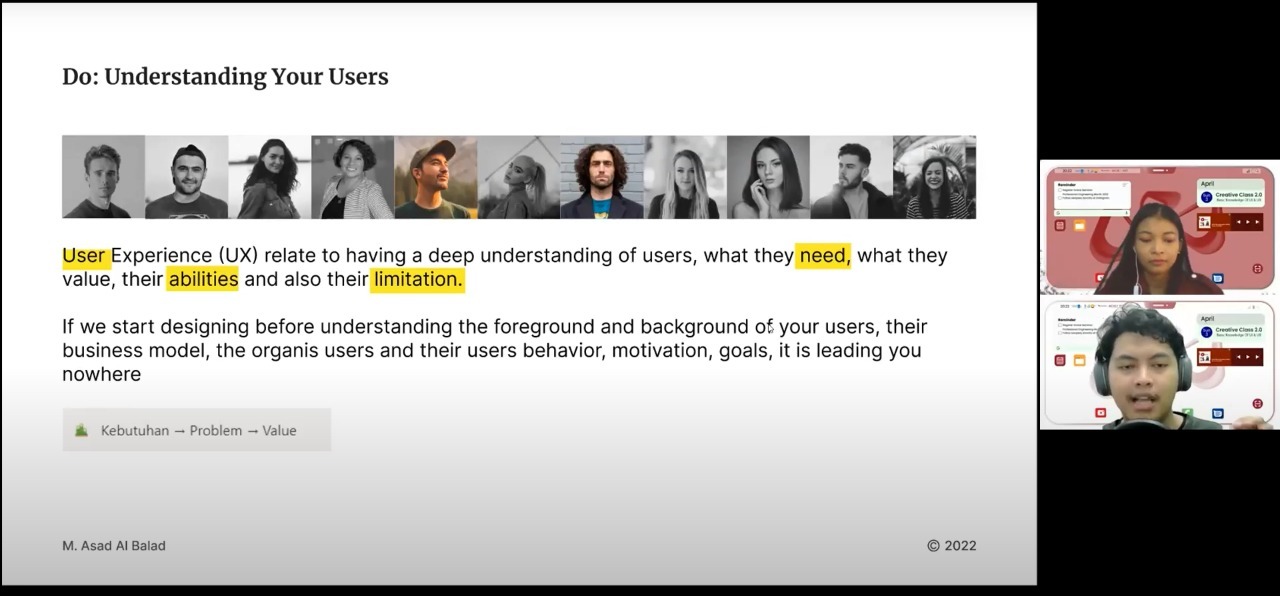 Muhammad Asad Al Balad, pembicara pada Creative Class AIChE ITS STudent Chaper memaparkan salah satu hal yang harus dilakukan dalam mendesain produk yakni memahami pengguna