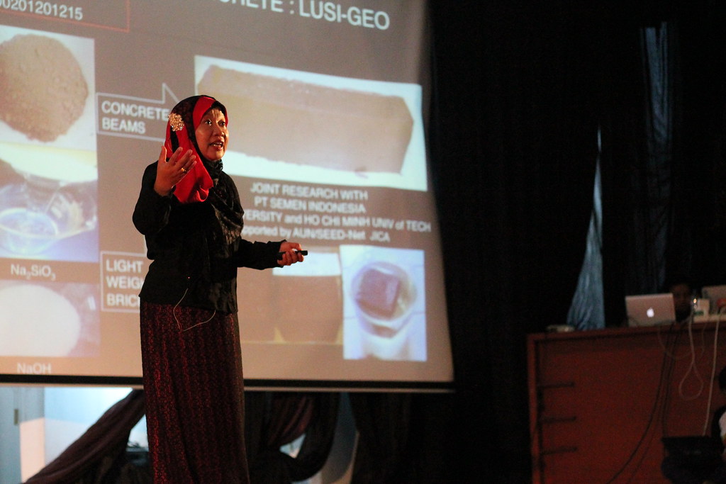 Dr Eng Januarti Jaya Ekaputri ST MT saat memaparkan penelitiannya tentang pemanfaatan abu vulkanik lumpur Sidoarjo sebagai substitusi semen