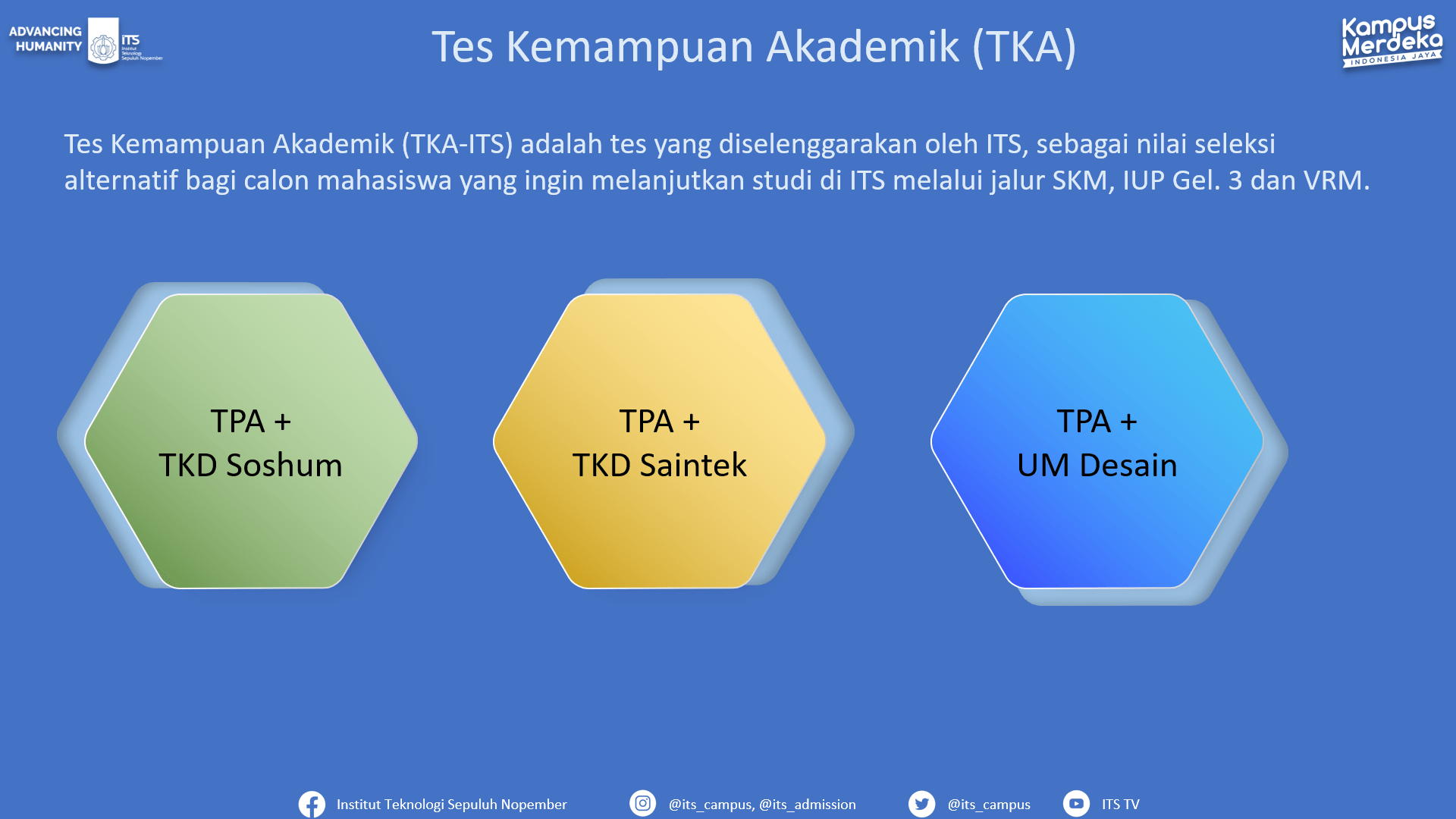 TKA ITS sendiri akan dilaksanakan pada 2 hingga 3 Juli dan 16 hingga 17 Juli 2022 mendatang secara hybrid. Peserta bisa melaksanakan tes secara daring maupun luring dengan datang langsung ke Kampus ITS. Tes ini terdiri tes potensial akademik (TPA), tes kemampuan dasar (TKD), dan ujian masuk (UM) desain untuk beberapa program studi tertentu. “UM dibutuhkan untuk masuk program studi yang berkaitan dengan seni seperti Desain Produk, Desain Interior, dan Desain Komunikasi Visual,” ungkapnya.