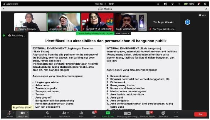 Diketuai oleh Dr Arina Hayati ST MT, program pengabdian masyarakat yang dilaksanakan pada 21 Desember 2021 lalu ini berfokus pada penerapan desain bangunan publik yang ramah pengguna. Termasuk bagi para penyandang disabilitas. “Kami ingin mewujudkan hak-hak yang sama antara para penyandang disabilitas dan masyarakat non-disabilitas dalam memanfaatkan bangunan,” tutur Arina.