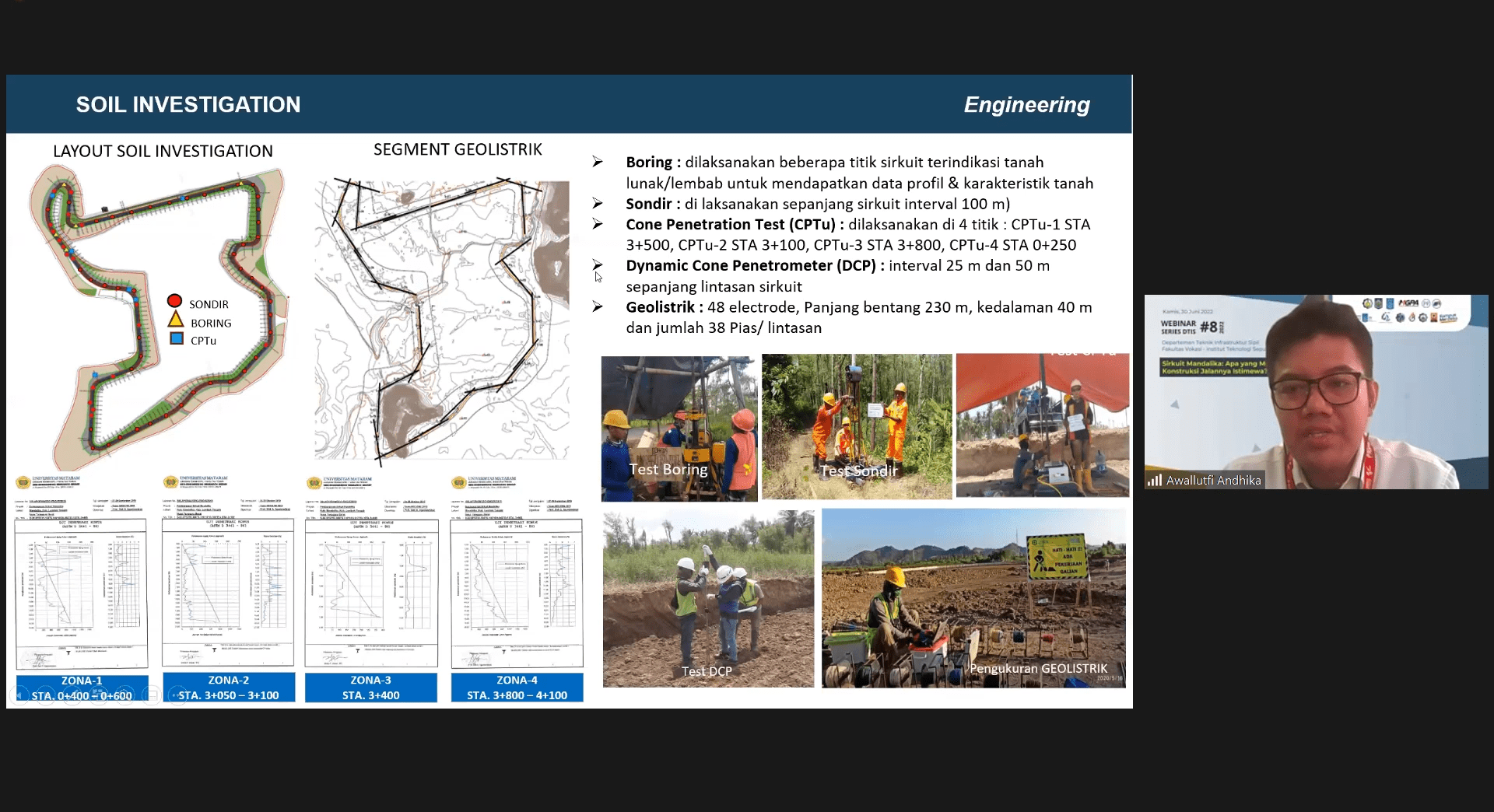 Oleh karenanya, dilakukan sejumlah tes seperti tes boring dan sondir dengan interval sirkuit 100 meter, tes geolistrik dengan jumlah 38 pias per lintasan, tes Cone Penetration Test (CPTu) yang dilaksanakan di 4 titik, dan terakhir tes Dynamic Cone Penetrometer (DCP) dengan interval 25 dan 50 meter sepanjang lintasan sirkuit. “Jika terdapat fenomena seperti ditemukannya mata air di salah satu zona, kami lakukan mitigasi dengan mengalirkan mata air tersebut,” paparnya.