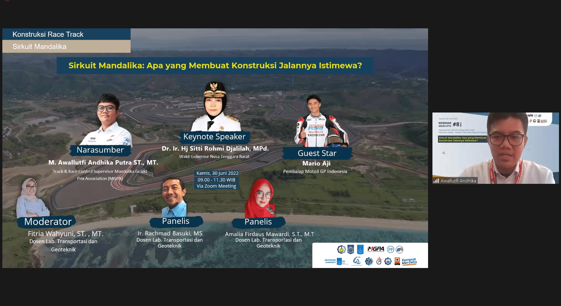 Track and Race Control Supervisor Mandalika Grand Prix Association (MGPA), M. Awallutfi Andhika Putra ST MT saat memberikan sambutan dalam webinar bertajuk Sirkuit Mandalika: Apa yang Membuat Konstruksi Jalannya Istimewa? oleh Departemen Teknik Infrastruktur Sipil ITS.