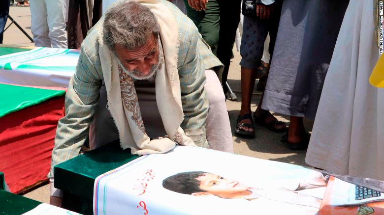 Seorang pria sedang berduka atas kematian salah satu anak yang menjadi korban serangan bus sekolah di Yaman (Sumber: STRINGER/AFP/Getty Images).