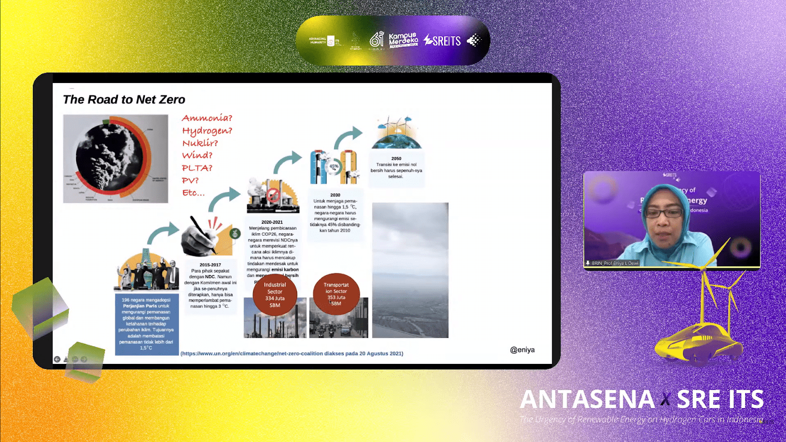 Peneliti Ahli Utama Badan Riset dan Inovasi Nasional (BRIN), Prof DrEng Eniya Listiani Dewi BEng MEng menjelaskan jika Indonesia termasuk ke dalam negara yang berkomitmen mencapai net–zero emissions pada 2060. “Menuju ke tujuan, Indonesia perlu mengimplementasikan pemanfaatan energi baru terbarukan (EBT) guna meningkatkan bauran energi nasional,” ujarnya dalam webinar Antasena dan SRE ITS, 15 Mei lalu.