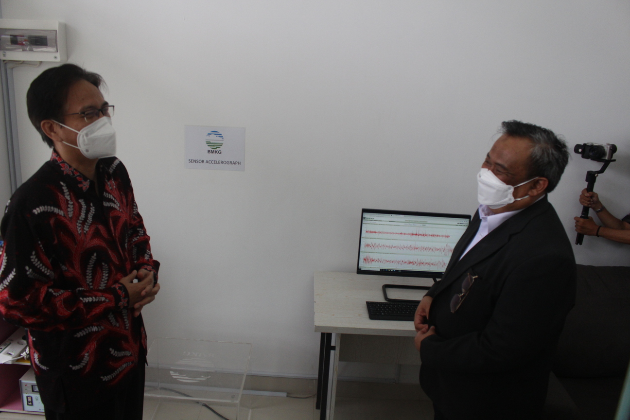 Rektor ITS, Prof Dr Ir Mochamad Ashari MEng IPU AEng (kiri) bersama Kepala Pusat Seismologi Teknik Geofisika Potensial dan Tanda Waktu BMKG, Rahmat Triyono ST Dipl Seis MSc sedang melihat Accelerometer yang dihibahkan oleh BMKGMaka dari itu, Teknik Geofisika ITS