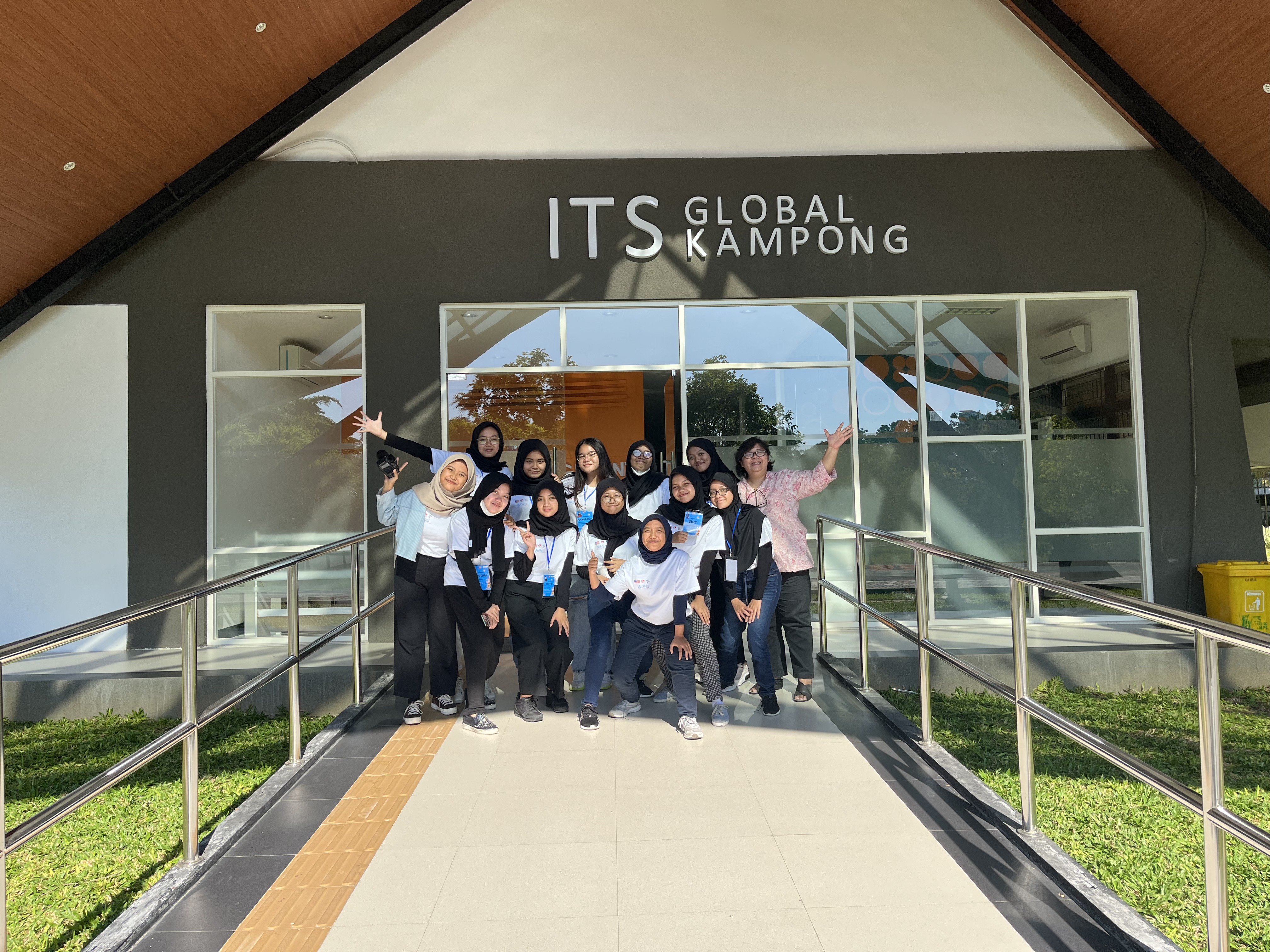 Para peserta WiSci Southeast Asia Camps 2022, counselors, dan Direktur ITS Global Engagement Assoc Prof Maria Anityasari, PhD berfoto bersama di depan kantor Global Kampoeng