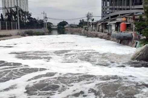 Buih dalam jumlah masif dihasilkan akibat akumulasi limbah detergen di Sungai Kalisari Damen (sumber: kompas)