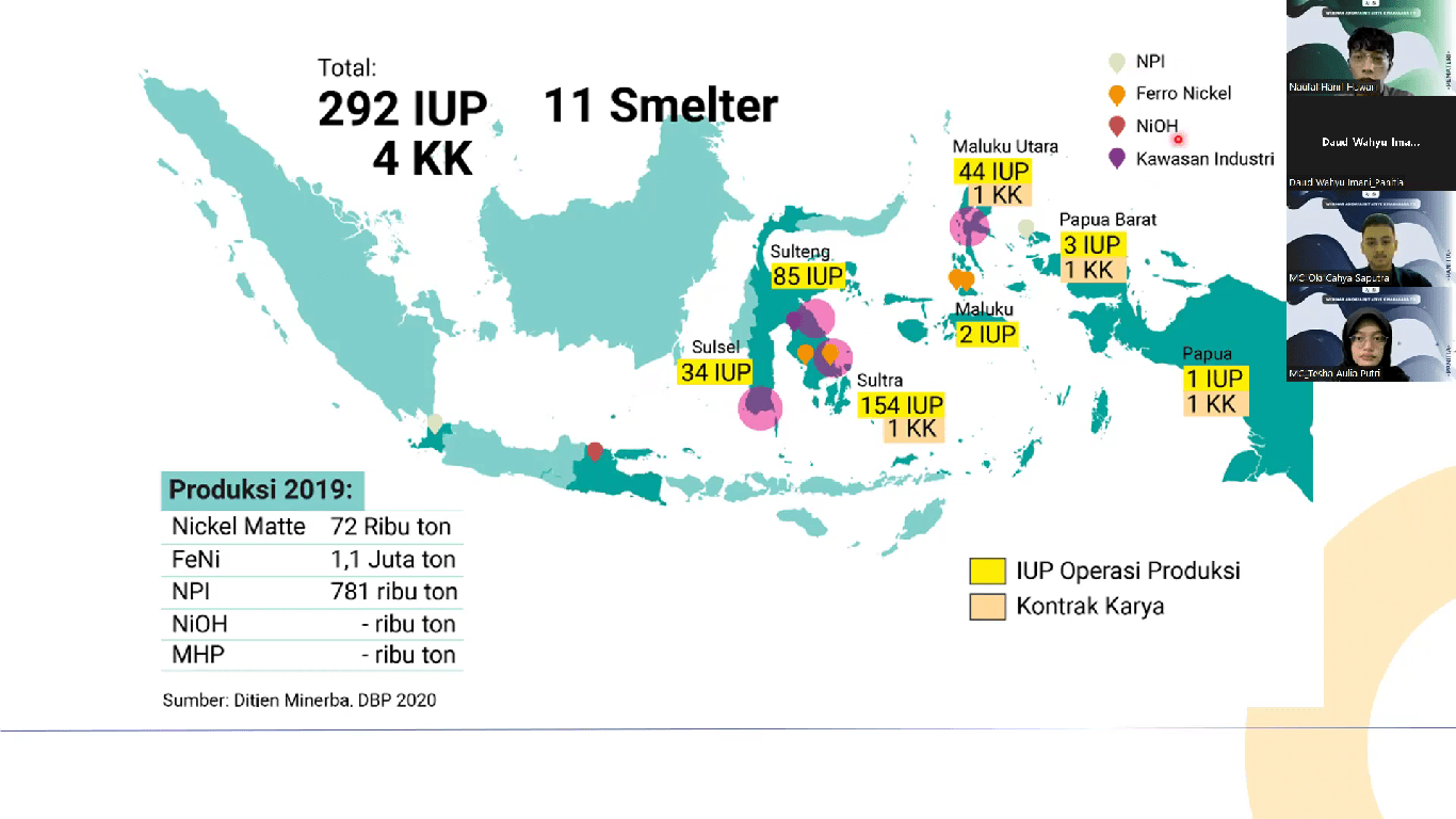 Namun, berdasarkan data tahun 2019, produksi nikel di Indonesia masih diperuntukkan untuk produksi baja anti karat, sedangkan produksi baterai belum dilakukan. “Untuk produksi baterai, Indonesia baru membangun smelter nikel di daerah Gresik, Jawa Timur yang diperkirakan menjadi yang terbesar di dunia,” ujar Naufal dalam acara webinar hasil kerja sama Mahagana ITS dengan Adidaya Intiative.