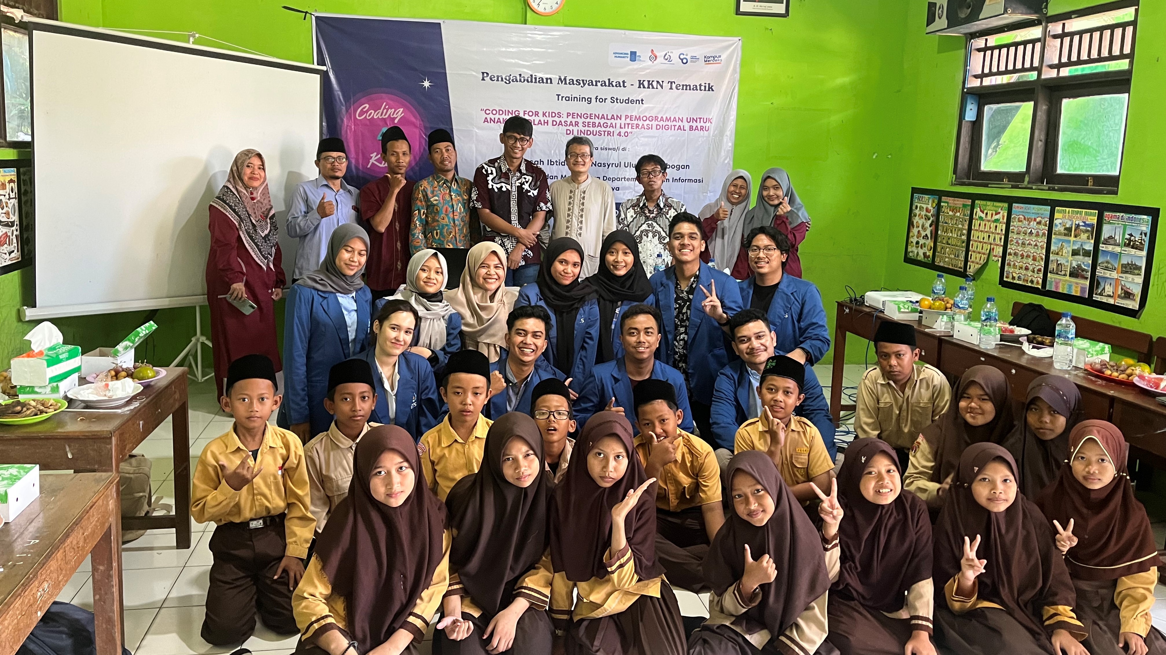 Tim KKN Departemen Sistem Informasi bersama para siswa dan guru MI Nasyrul Ulum 1 saat pelaksanaan pelatihan pemrograman