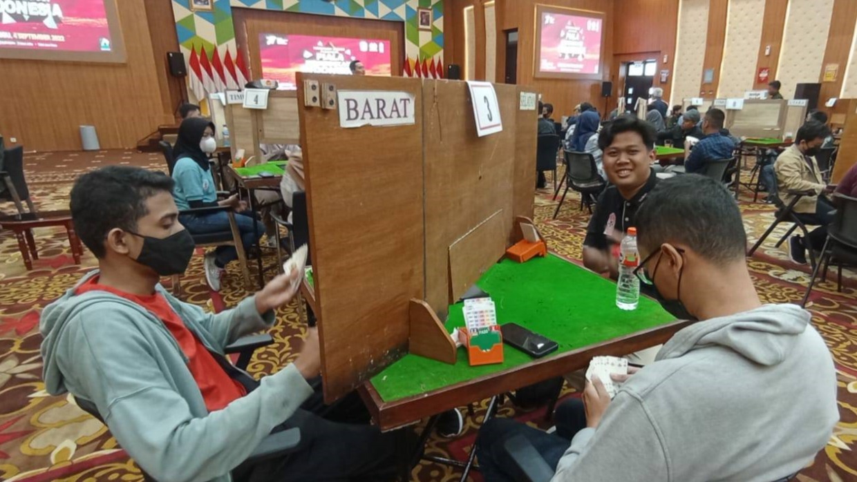 Muhammad Amin (berbaju merah) dan Achmad Nizar Kamal Zawawi (berbaju hitam) saat bertanding Bridge pada kompetisi yang diadakan di Badan Pengembangan Sumber Daya Manusia (BPSDM) Provinsi Jawa Timur