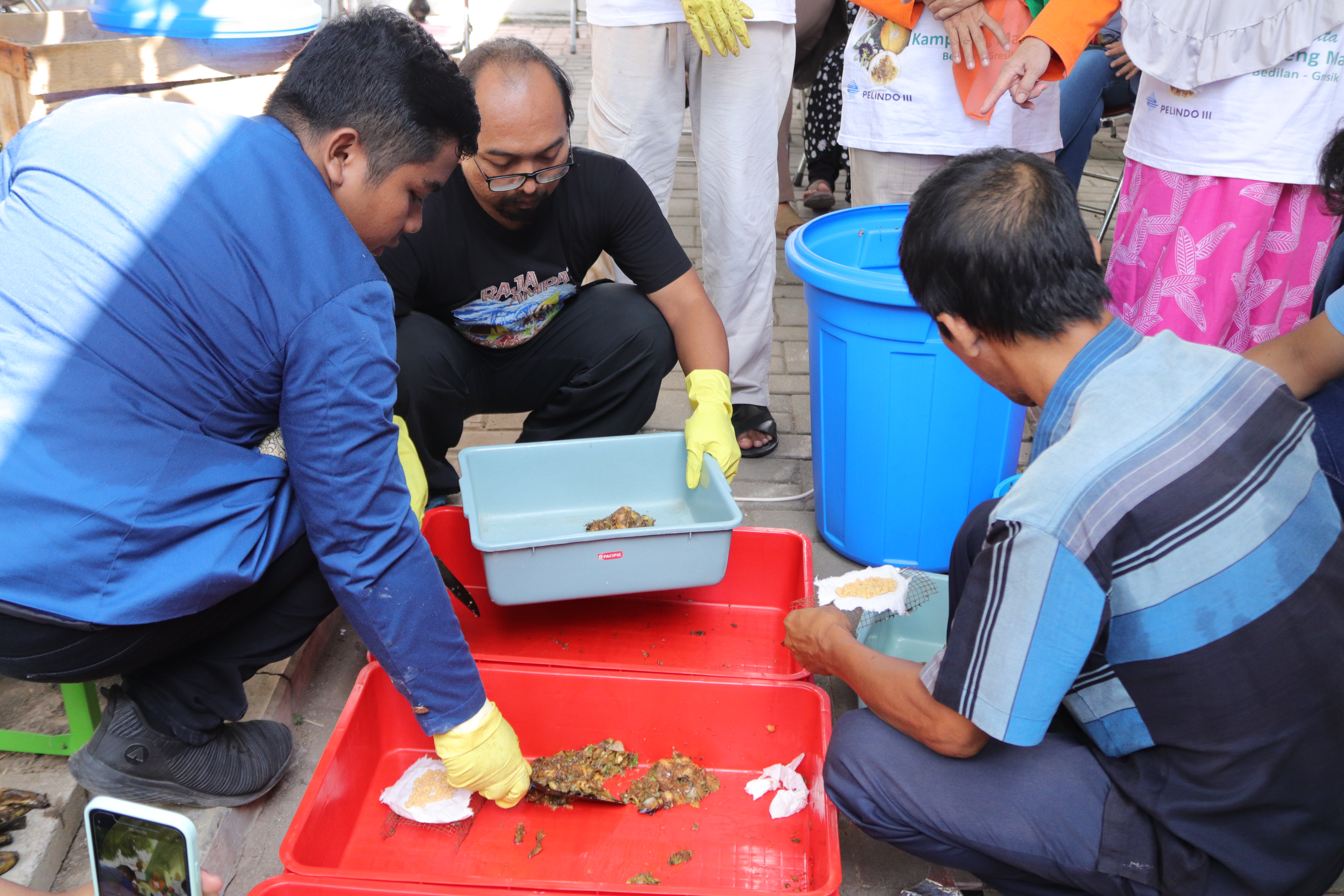 Usai dilakukan penyuluhan, masyarakat diajak untuk turun langsung membudidayakan maggot dari kondisi telur hingga berubah menjadi larva. Kegiatan ini dipandu langsung oleh tim ahli Maggot Black Soldier Flies (BSF) Surabaya dan dimulai dengan mencacah sampah organik yang telah terkumpul. Selanjutnya, telur maggot BSF dan sampah yang tercacah disatukan dalam satu wadah kecil. “Telur maggot akan berubah menjadi larva dalam kurun waktu 3 hingga 4 hari,” beber Wafi.