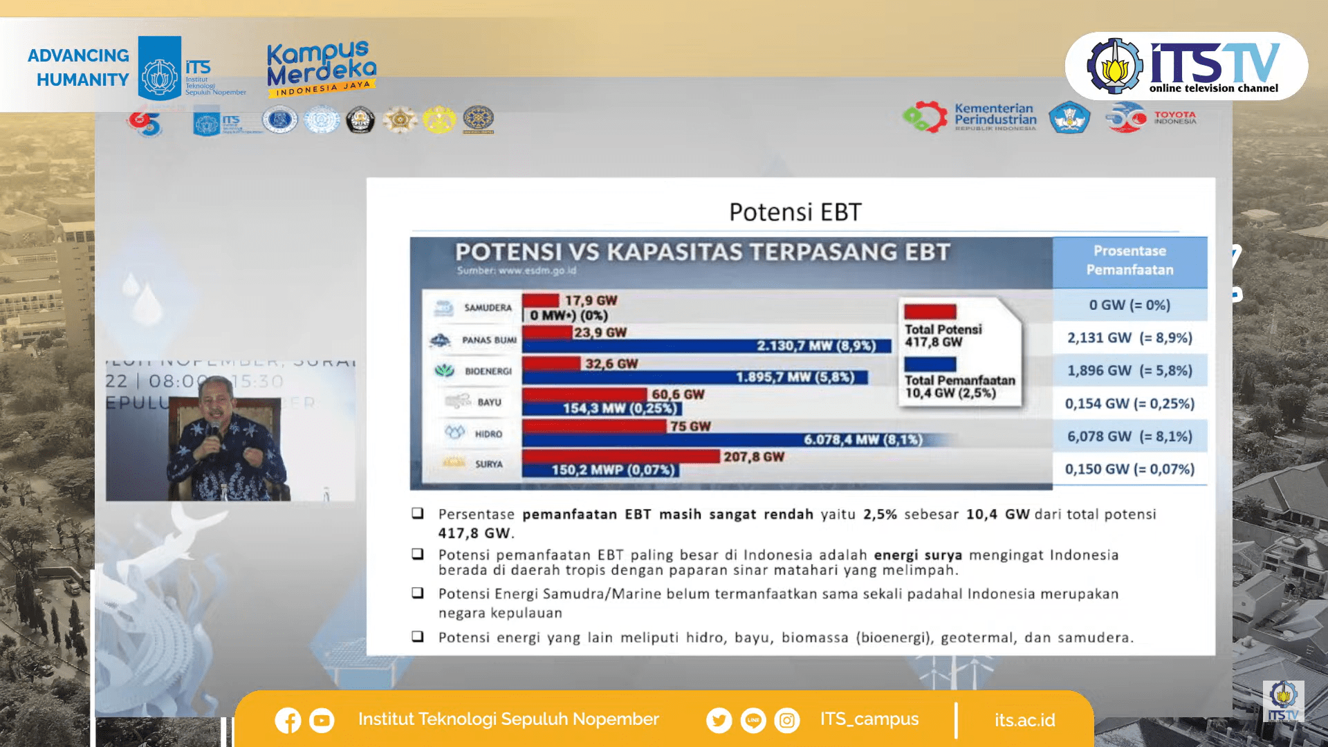 Nyatanya, Joni mengungkapkan, pengembangan EBT di Indonesia masih belum maksimal. Hal ini disebabkan konsumsi energi dalam jumlah terlalu besar. “Agar dapat mencapai target besar di tahun ini, perlu ada perbaikan sistem industri, infrastruktur, dan moda transportasi,” tutur mantan Rektor ITS ini.