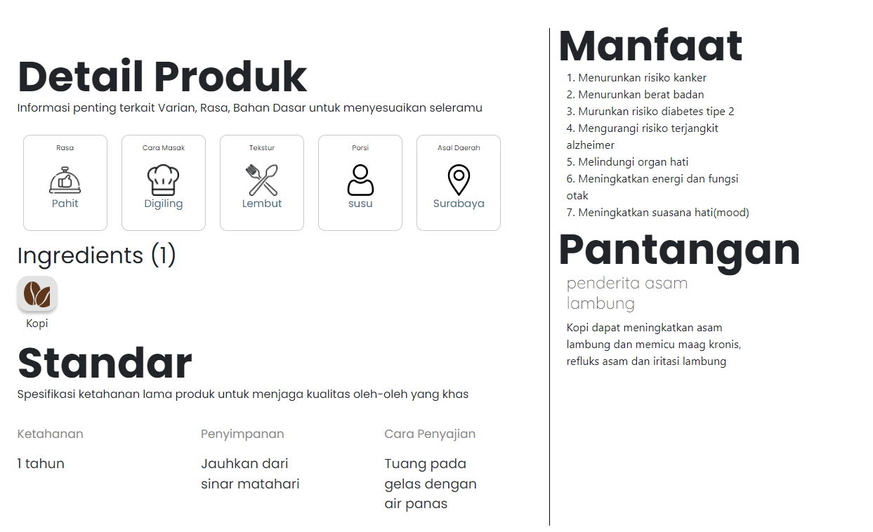 Salah satu fitur edukatif pada situs Oasis Oleh-oleh, yaitu informasi manfaat, cara penyajian, pantangan produk, hingga trivia-trivia menarik