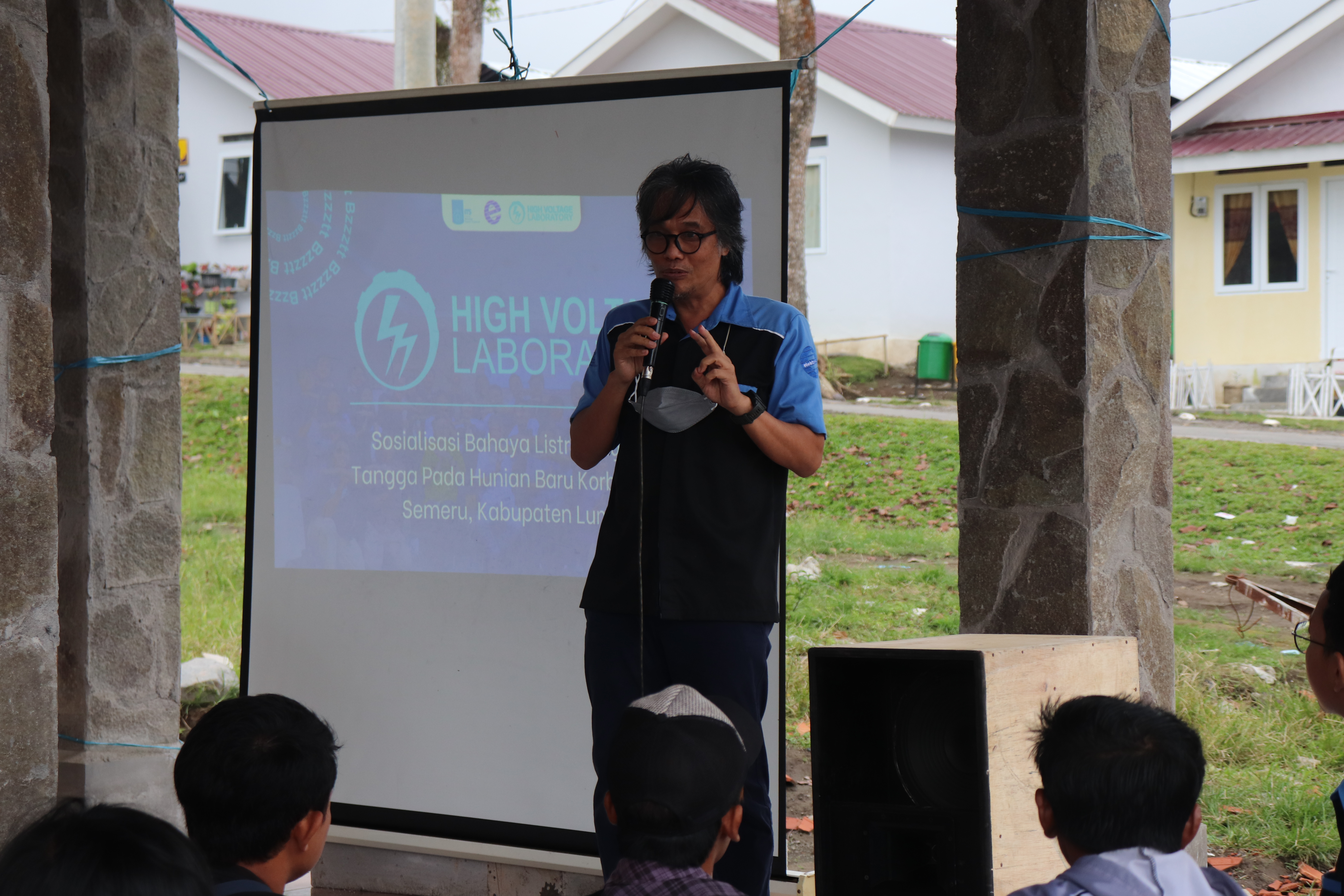 Kampus ITS, ITS News – Penggunaan listrik harus disesuaikan dengan kapasitas yang tersedia untuk mencegah terjadinya kerusakan instalasi. Untuk itu, program Pengabdian kepada Masyarakat Institut Teknologi Sepuluh Nopember (Abmas ITS) mengadakan sosialisasi bagi masyarakat di kawasan Hunian Tetap Sementara (Huntara) Semeru untuk meningkatkan kewaspadaan bahaya penggunaan listrik.