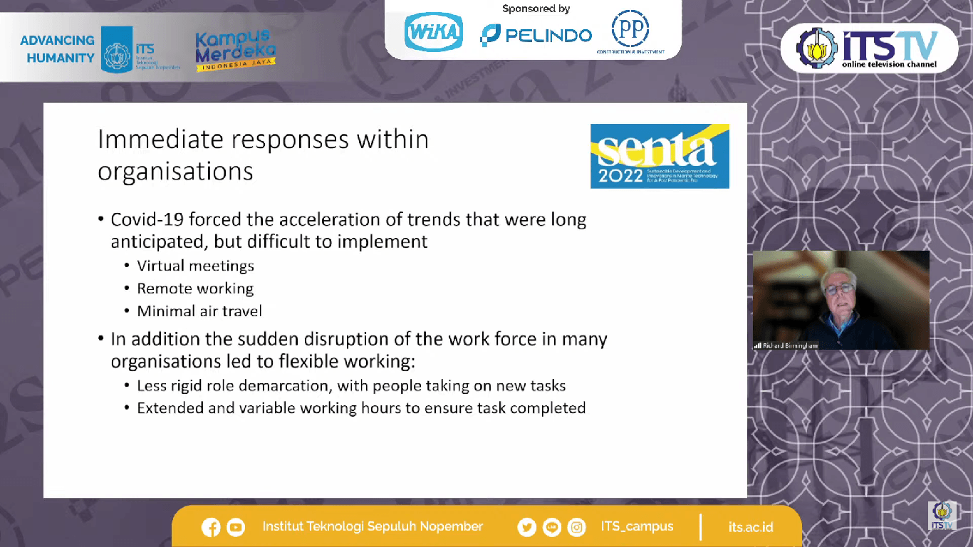 Menurutnya, dampak tersebut menuntut suatu perusahaan atau organisasi untuk memiliki ketangguhan dan fleksibilitas agar dapat beradaptasi dengan kondisi baru ini. “Salah satu penerapannya dapat membuat demarkasi peran yang tidak terlalu kaku sehingga orang lain dapat mengerjakan tugas baru,” jelas Richard jauh dari negara asalnya.