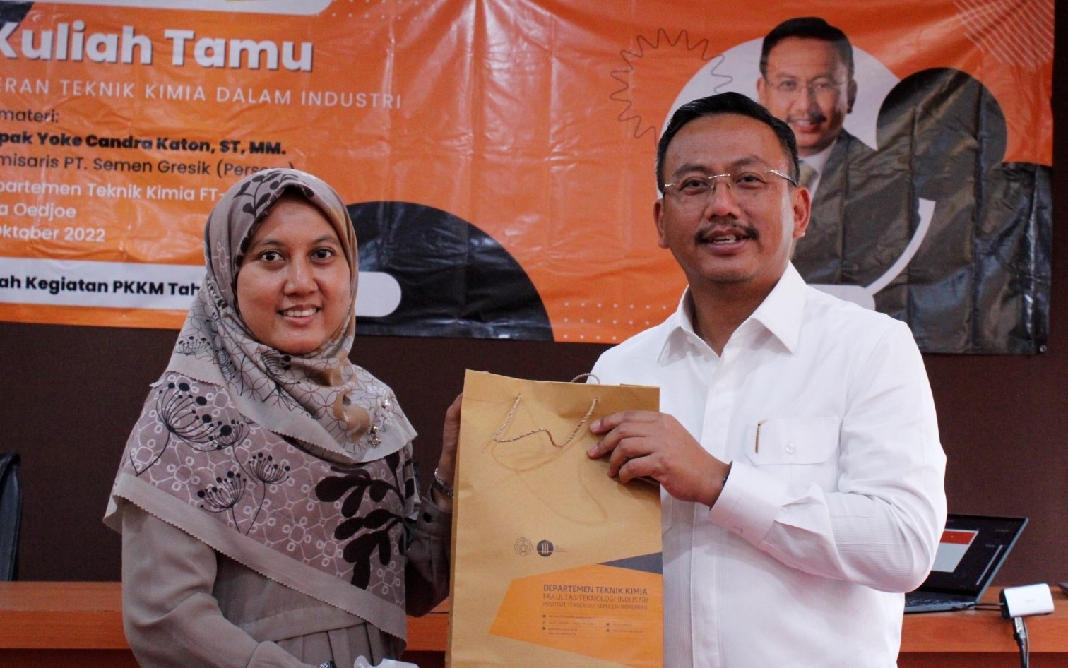 Kepala Departemen Teknik Kimia ITS, Dr Eng Widiyastuti ST MT memberikan cendera mata kepada Yoke Candra Katon ST MM.