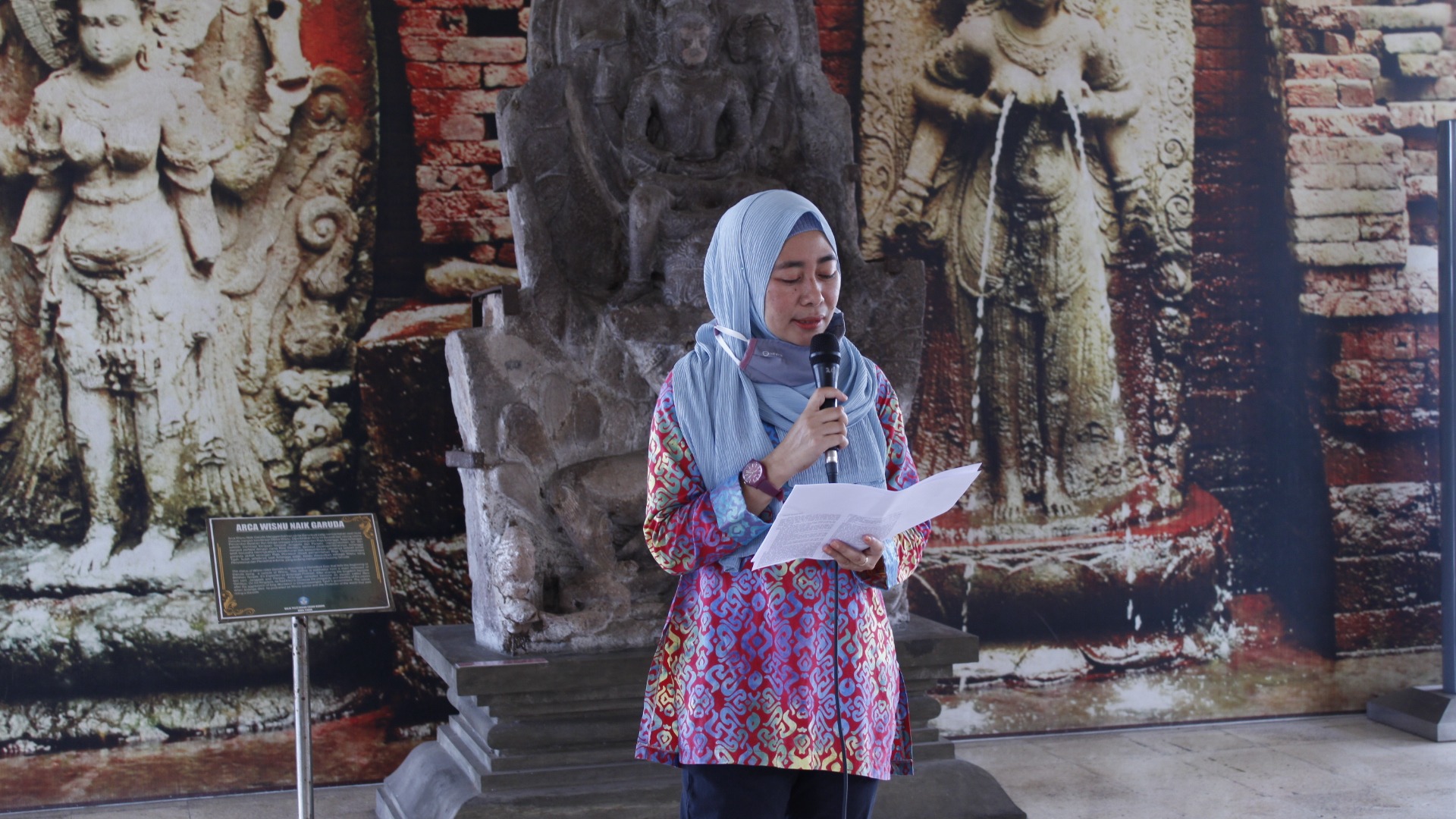 Pemandu dari Unit Pengelolaan Informasi Majapahit (PIM), Yanti saat menceritakan kisah Panji kepada mahasiswa PMM, Sabtu (15/10)