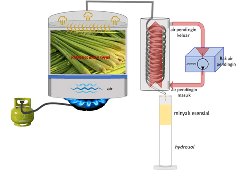 Pada dasarnya, minyak atsiri merupakan komoditi ekstrak alami dari jenis tumbuhan herbal. Dalam proses ekstraksi minyak atsiri, teknik distilasi menggunakan pelarut air paling banyak diterapkan. Dimana sampel dari komponen tanaman herbal yang hendak diekstraksi dicampur dengan air kemudian dididihkan.