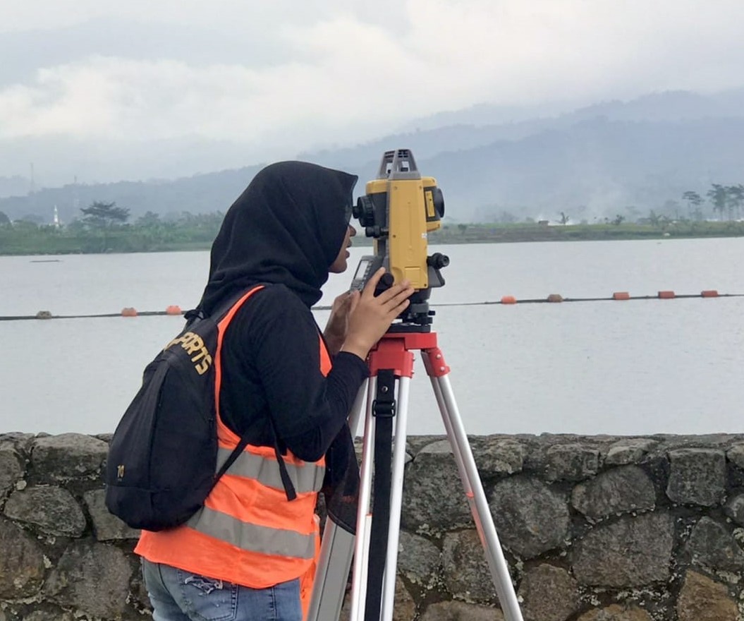 Pemanfaatan total station oleh tim KKN Abmas Departemen Geomatika ITS dalam melakukan survei di area Waduk Selorejo