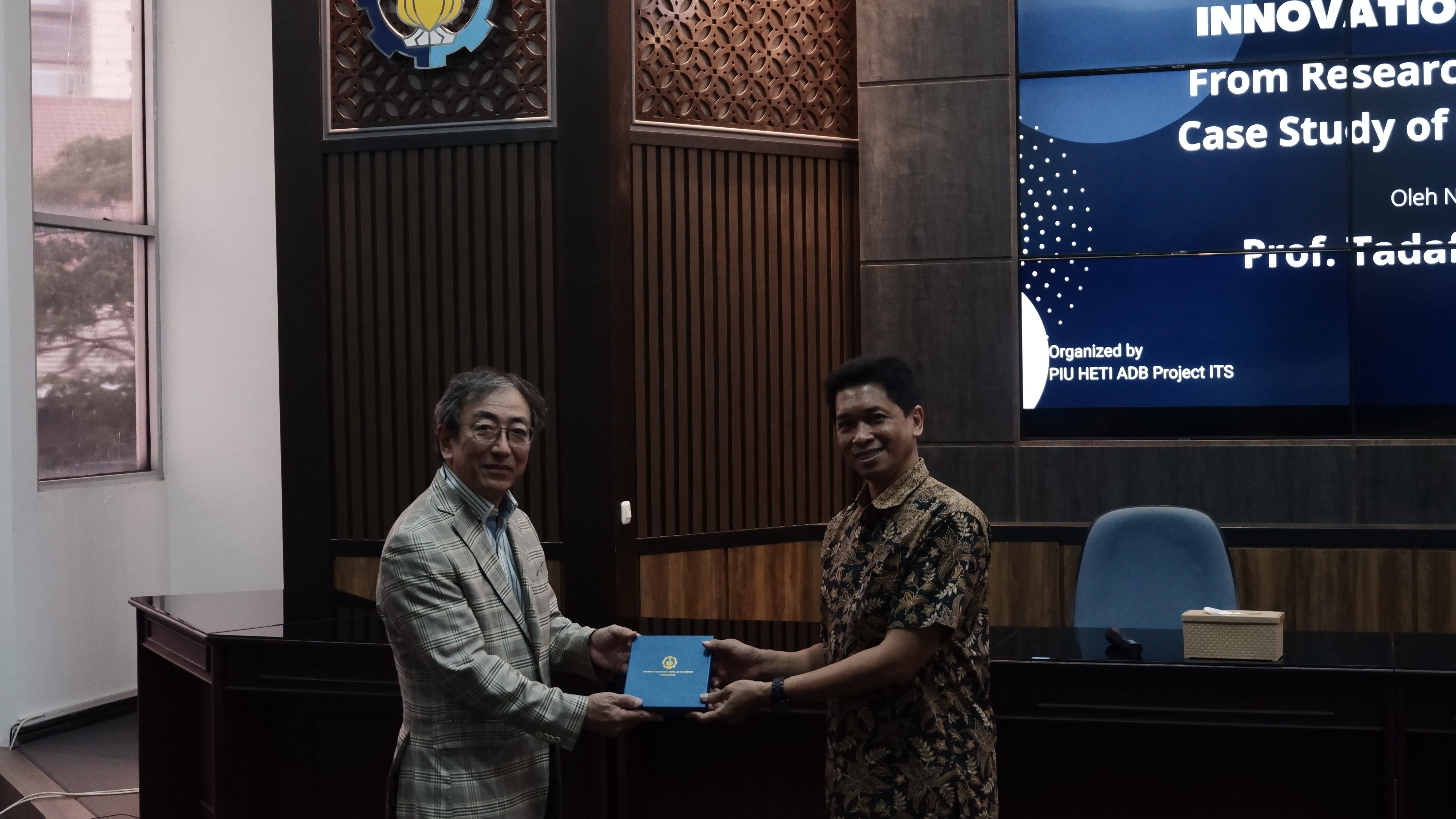 Wakil Rektor IV ITS, Bambang Pramujati ST MSc Eng PHD (kanan) menyerahkan cendera mata kepada Prof Tadafumi Adschiri PhD (kiri)