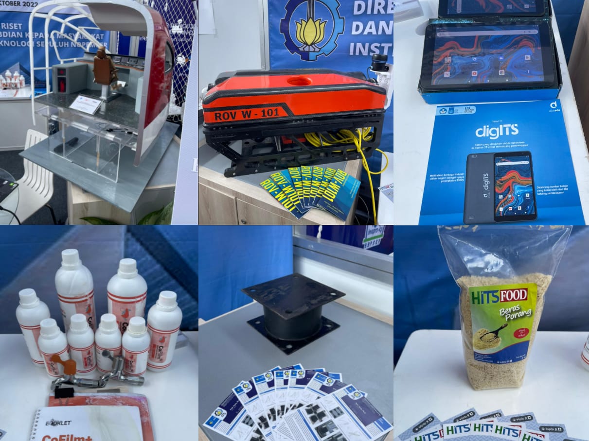Produk riset dan inovasi dari ITS dalam InaRI Expo 2022, (dari kiri atas) simulator lokomotif kereta api cepat, Remotely Operated Vehicle (ROV), tablet DIGITS, CoFilm, isolator komposit, dan beras porang