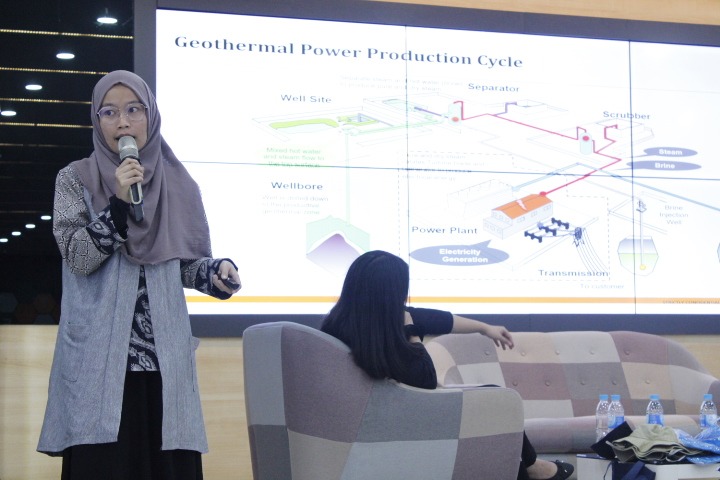 Selaras dengan penjelasan tersebut, pembicara kedua yang merupakan Geothermal Production Engineer pada salah satu perusahaan geotermal nasional, Rindang Riyanti menjabarkan cara kerja pembangkit geotermal. Panas bumi di bawah permukaan akan memanaskan air tanah, air ini kemudian menjadi uap yang menggerakkan turbin generator listrik. “Listrik ini akan dialirkan ke transmisi PLN untuk didistribusikan,” ucap Rindang.