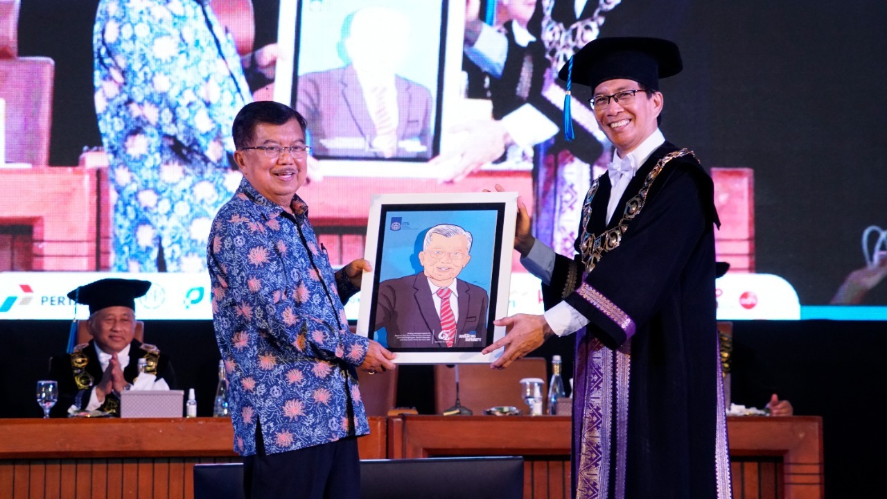 Dr (HC) Drs Muhammad Jusuf Kalla menerima cinderamata berupa sketsa diri karya dosen ITS dari Rektor ITS Prof Dr Ir Mochamad Ashari MEng IPU AEng