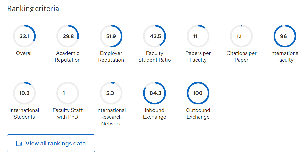 Indikator yang dimaksud meliputi Academic Reputation sebesar 30 persen, Employer Reputation sebesar 20 persen, Faculty Student sebesar 10 persen, Citations per Paper sebesar 10 persen, Papers per Faculty sebesar lima persen, Staff with PhD sebesar lima persen, International Faculty sebesar 2,5 persen, International Students sebesar 2,5 persen, Inbound Exchange sebesar 2,5 persen, Outbound Exchange sebesar 2,5 persen, dan International Research Network sebesar 10 persen.