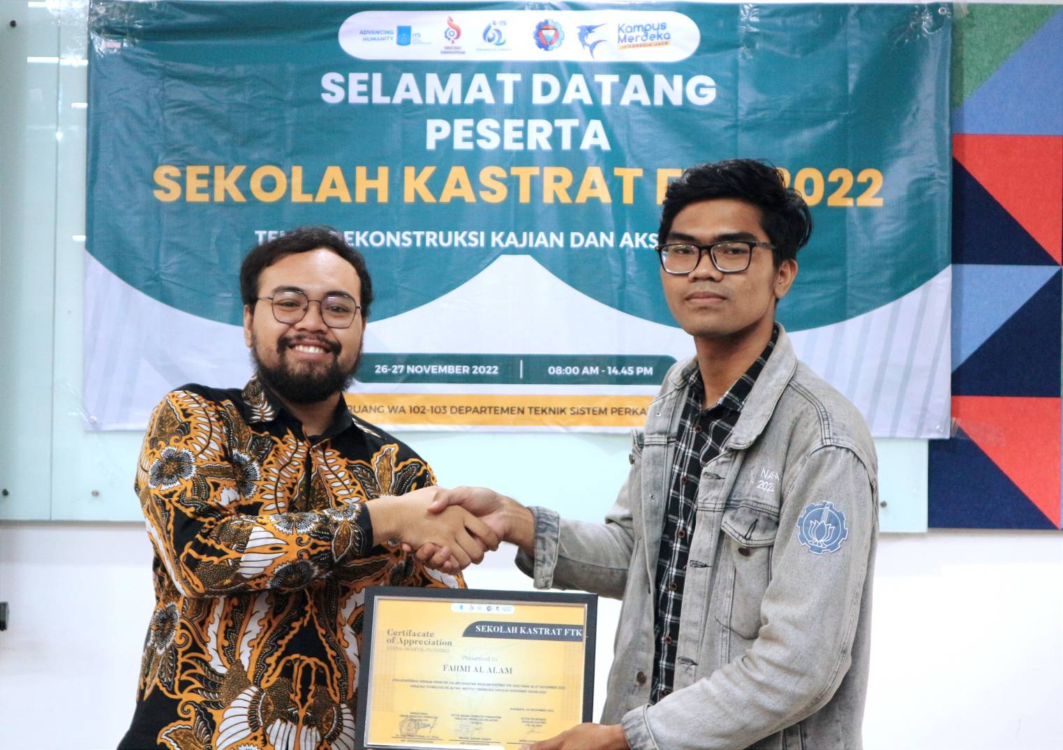 Ketua Pelaksana Sekolah Kajian Strategis (Kastrat) 2022, Indra Ilyas Rahman (kanan) bersama Wakil Menteri Koordinator BEM ITS periode 2019-2020 Kolaborapi, Fahmi Al Alam (kiri)