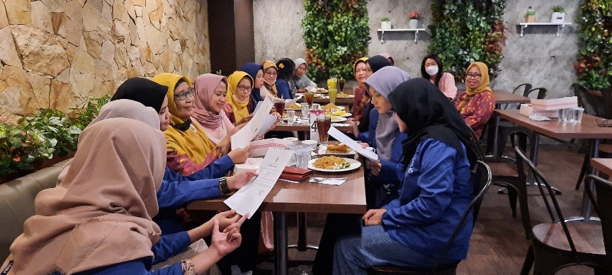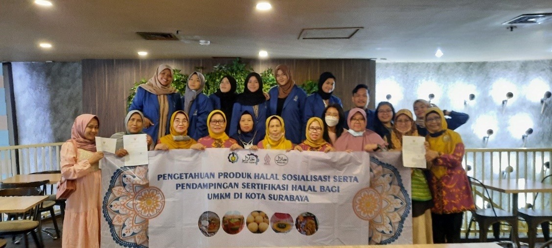 Tim KKN Abmas ITS dan pelaku UMKM usai mengadakan sosialisasi materi pengetahuan produk dan sertifikat halal kepada pelaku UMKM di Surabaya