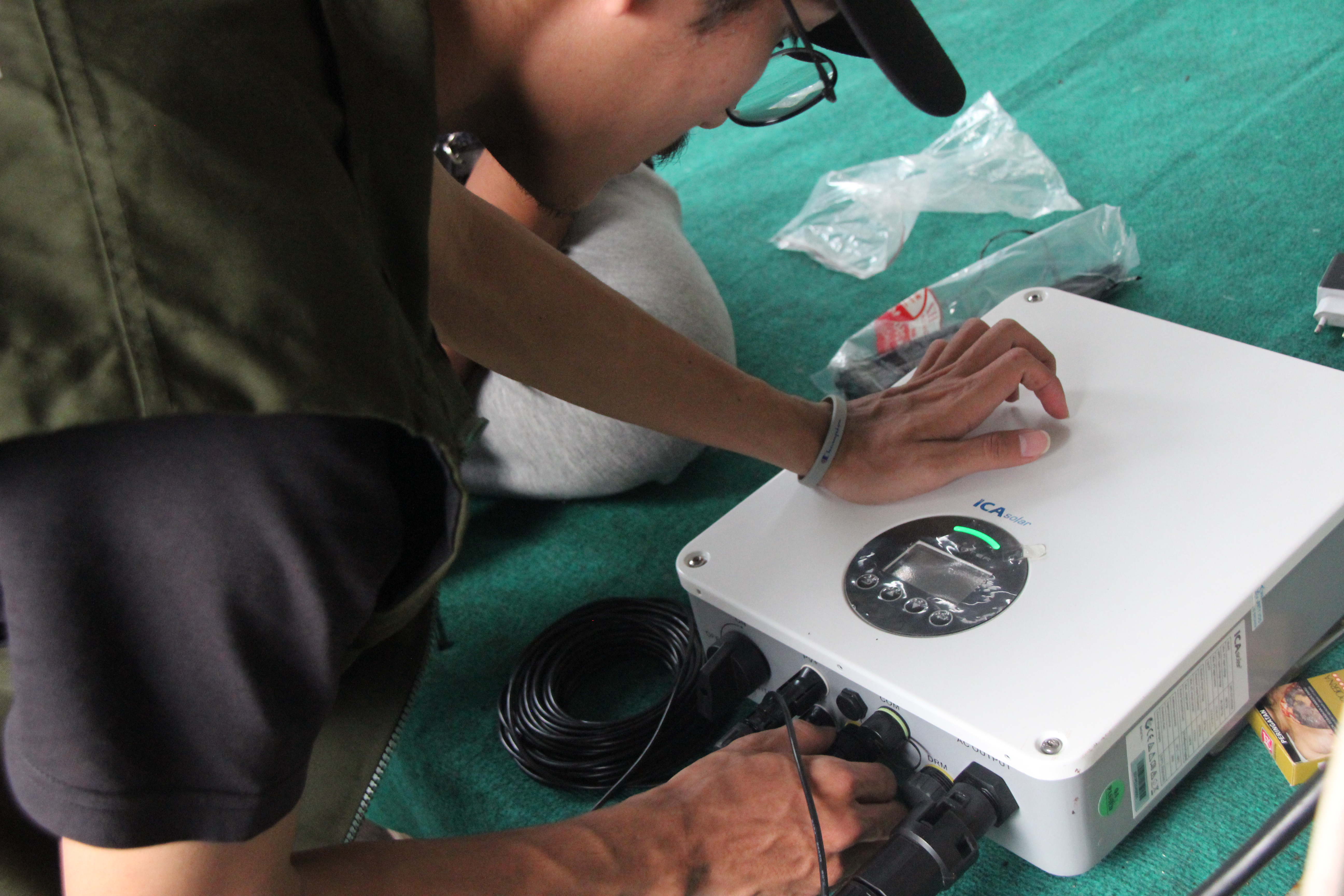 Penanggung jawab program Rumah Pengabdian, Riza Dwi Febri Saputra tengah melakukan pemasangan panel surya di Desa Segorotambak, Sabtu (26/11)