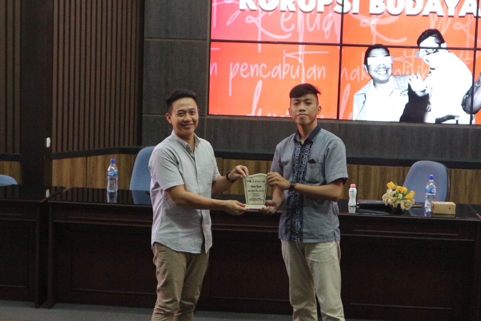 Taufik Rachman SH LLM PhD (kiri) saat sesi penyerahan plakat sebagai kenang-kenangan dari kegiatan Diskusi Publik bertema Korupsi Budaya Tirani