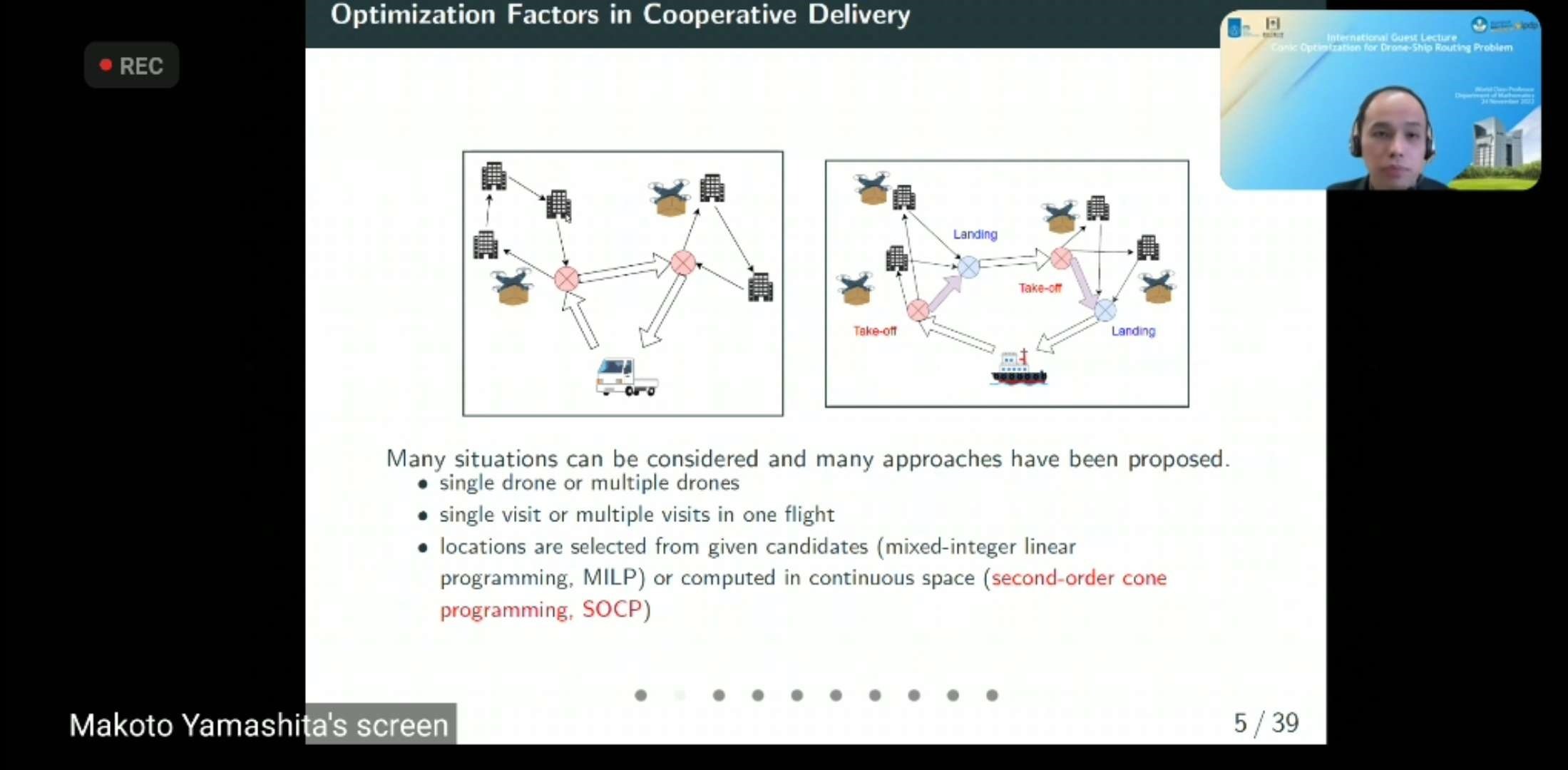 Kampus ITS, ITS News — Selain sebagai alat fotografi udara, drone dapat digunakan sebagai media pengiriman barang. Namun, pesawat nirawak kendali jarak jauh ini memiliki masalah inheren yaitu jarak yang terbatas. Untuk itu, melalui kuliahnya, Prof Makoto Yamashita memberikan alternatif solusi menggunakan pendekatan model matematis.