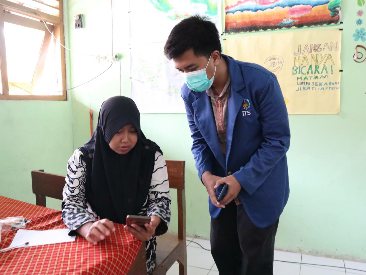 salah satu mahasiswa KKN Abmas ITS saat sedang mendampingi salah satu guru saat praktik penerapan aplikasi e-learning