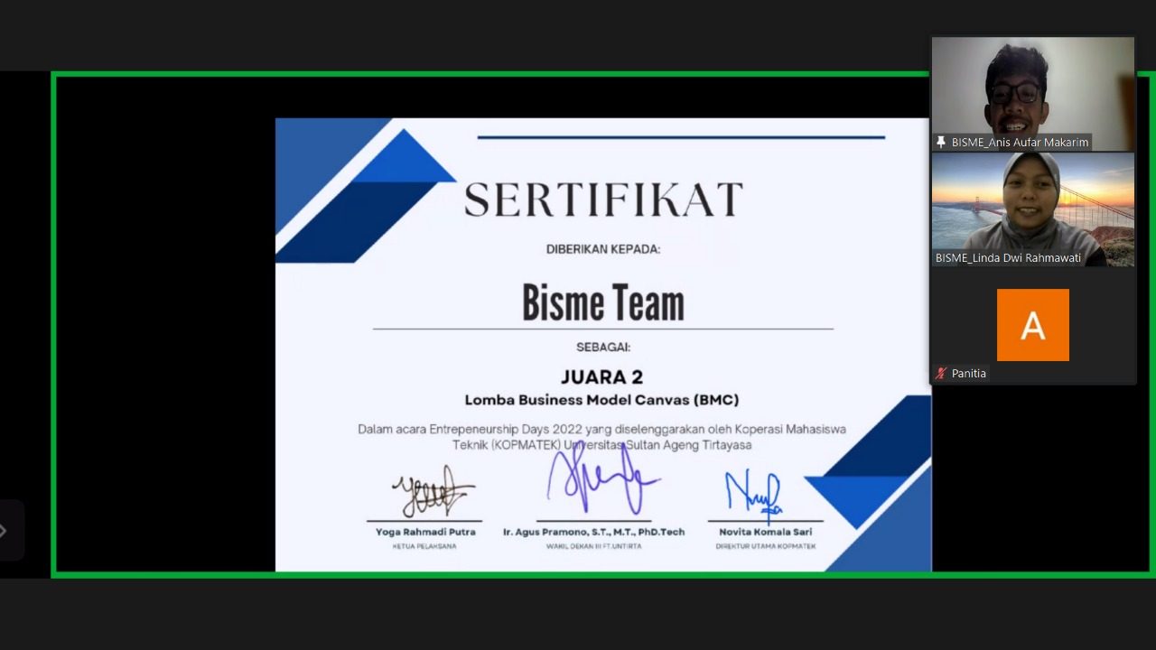 Linda Dwi Rahmawati bersama Anis Aurat Makarim berhasil memenangkan juara 2 Lomba Business Model Canvas (BMC) yang diselenggarakan Universitas Sultan Ageng Tirtayasa