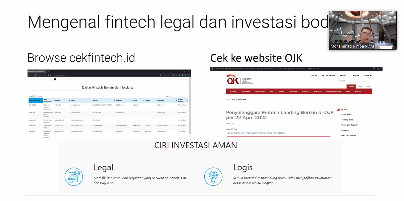 Oleh karena itu, Rimba menyarankan masyarakat untuk lebih waspada dengan melakukan pengecekan suatu investasi melalui website resmi Otoritas Jasa Keuangan (OJK). “Idealnya, apabila terdaftar dalam website OJK, maka dapat dipastikan bahwa investasi tersebut legal,” tuturnya dalam webinar Chemistry Youth Entrepreneur Class 2.0, Sabtu (24/12).