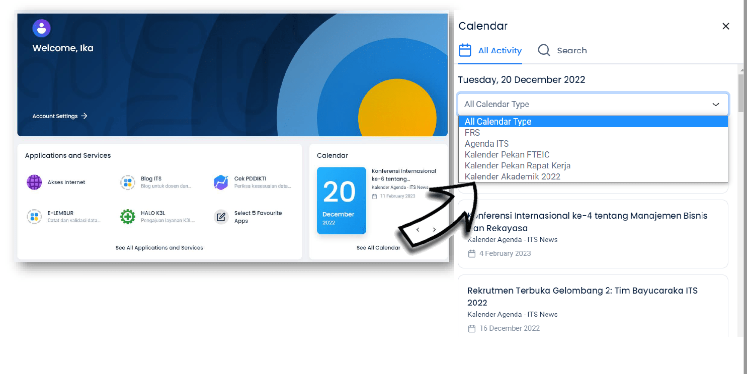 Setelah masuk ke MyITS Portal, akan terdapat sebuah kotak kecil di sebelah kanan layar dengan judul Kalender. Untuk membuka MyITS Calendar, klik Lihat Semua Kalender di bagian bawah kotak tersebut. Dari sini, pengguna dapat mengakses informasi mengenai seluruh kegiatan yang sedang diadakan di lingkup ITS. Untuk menyortir informasi yang khusus untuk unit tertentu, klik kolom “Semua Jenis Kalender” di bawah tanggal lalu pilih unitnya.