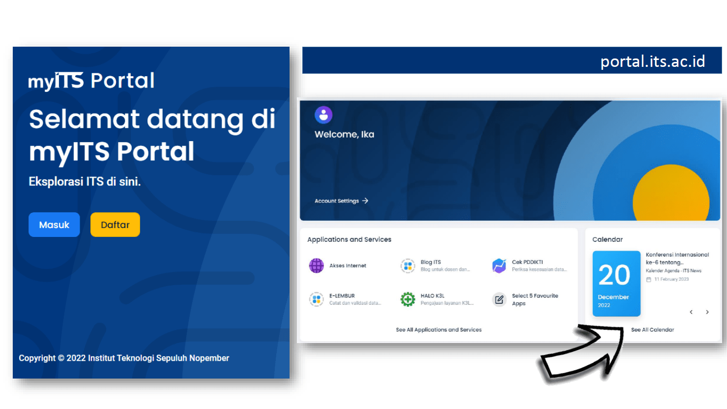 Fitur-fitur tersebut dapat dimanfaatkan dengan cara mengakses MyITS Calendar melalui MyITS portal dengan cara membuka laman portal.its.ac.id. Lalu, masuk ke MyITS Portal dengan memasukkan MyITS ID beserta kata sandinya.