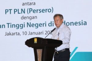 Direktur Utama PT PLN (Persero) Darmawan Prasodjo saat memaparkan rancangan strategis kerja sama riset inovasi energi dan beasiswa nasional