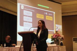 Dr Ira Margaritha Sugianto BSc SH MTM saat memaparkan disertasinya pada Sidang Terbuka Promosi Dokor di Hotel Bumi Surabaya