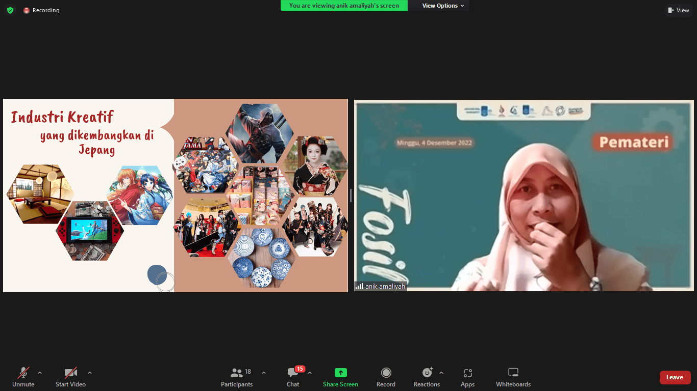 Pembicara pada webinar kali ini, Anik Amaliyah Spd, membeberkan mengenai isu-isu terbaru tentang industri kreatif dan bisnis digital di Jepang, hingga berbagai solusi yang bisa diterapkan di Indonesia. Bertemakan Belajar dari Jepang: Industri Kreatif dan Bisnis Digital, Anik mengawali kegiatan tersebut dengan mengulik gaya hidup masyarakat Jepang.
