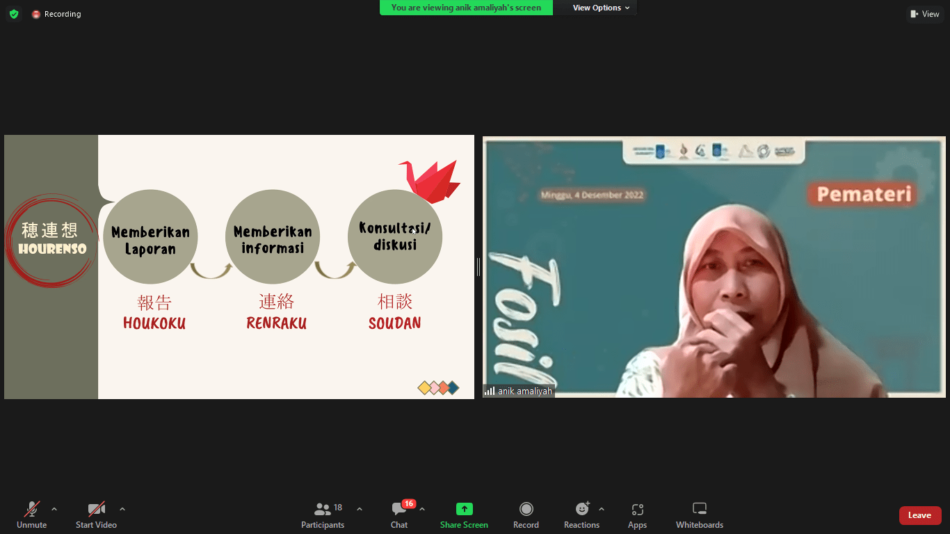 Selain filosofi Kaizen, Anik menerangkan pula mengenai konsep etos kerja yang menjadi jati diri masyarakat Jepang. Ialah Hourenso (Houkoku, Renraku, Soudan), budaya berdiskusi dengan cara yang baik dan benar untuk mengatasi suatu permasalahan kerja. Oleh karena itu, Jepang sangat menghargai keterbukaan dan harmoni untuk mendemonstrasikan konsistensi antar filosofi.