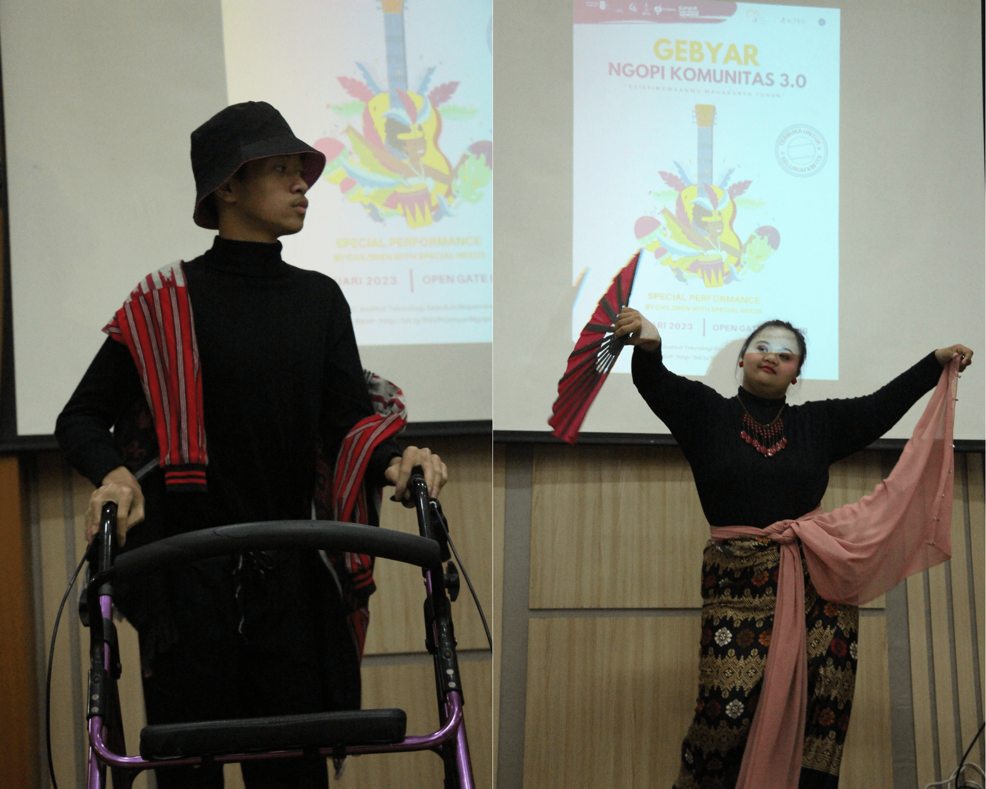 Aksi dua ABK saat menampilkan fashion show (kiri) dan tari tradisional (kanan) di atas panggung