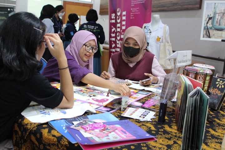 Mahasiswi panitia dari Departemen Desain Komunikasi Visual (DKV) saat mempersiapkan stan untuk menyambut kedatangan para peserta CREABIZ Open Day