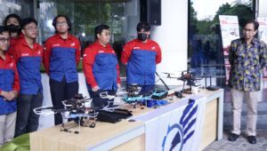 Tiga drone terbaru dari tim Bayucaraka ITS, yakni Soero Alpha, Soero Beta, dan Soero Airon usai diluncurkan secara resmi oleh Rektor ITS Prof Dr Ir Mochamad Ashari MEng (kanan)