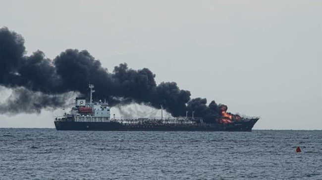 Kebakaran pada MT Kristin nampak terjadi pada bagian haluan kapal (sumber: instagram/yashaaa_29)