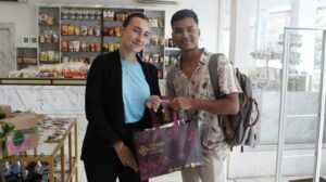 Alexiane Laroye (kiri) dan Raphael Bunly Bureau, mahasiswa asing ITS asal Prancis usai berbelanja produk UMKM di Surabaya Kriya Galeri MERR