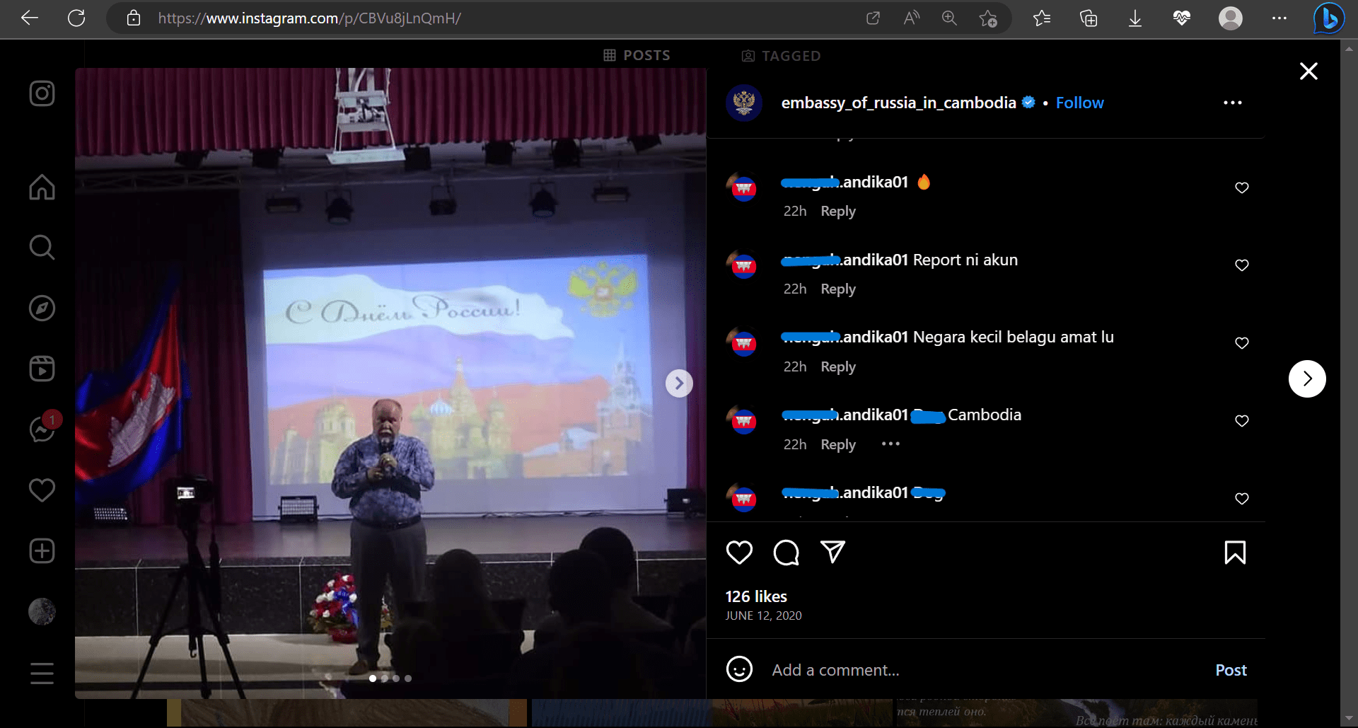 Tangkapan layar komentar salah satu warganet Indonesia di akun Kedutaan Rusia untuk Kamboja (Sumber: akun instagram embassy_of_russia_in_cambodia)